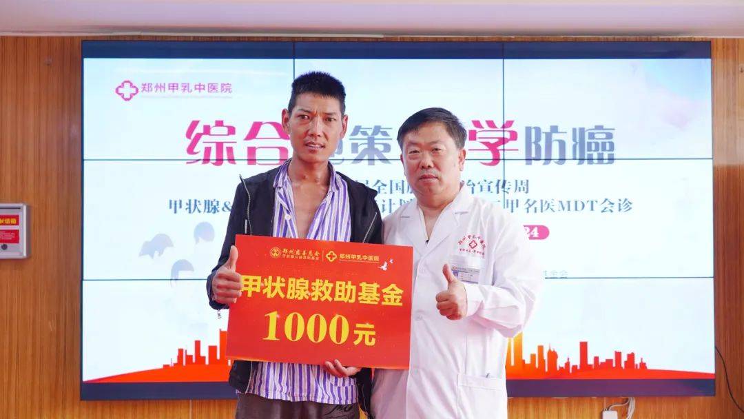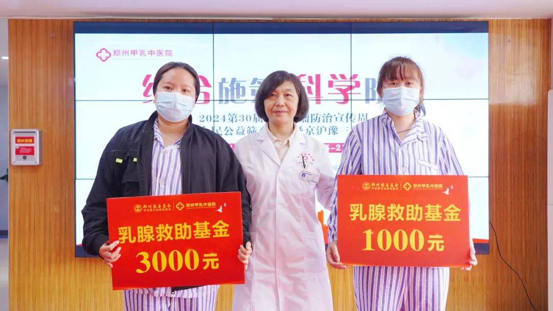 4月15日恰逢郑州慈善总会甲乳慈善救助基金启动三周年,郑州慈善总会项目部杜霏霏部长亲临活动现场,见证了“甲状腺&乳腺全民公益筛查计划暨京沪豫三甲名医MDT学术会诊”系列公益活动的启动,并现场为7位符合救助条件的甲状腺、乳腺患者分别发放了1000元、2000元、3000元和减免的慈善基金,以帮助他们解决经济压力,通过有效治疗摆脱疾病困扰,重拾信心与希望,拥抱更加美好的生活。